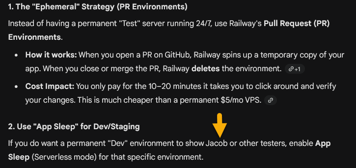 In another thread, I asked Gemini how to optimize the cost of maintaining development, testing, and production environments on Railway. This was a brand new thread. I have had several previous conversations about Railway, which I really like, and about its configuration. However, I never mentioned my son’s name in any of those Railway discussions.