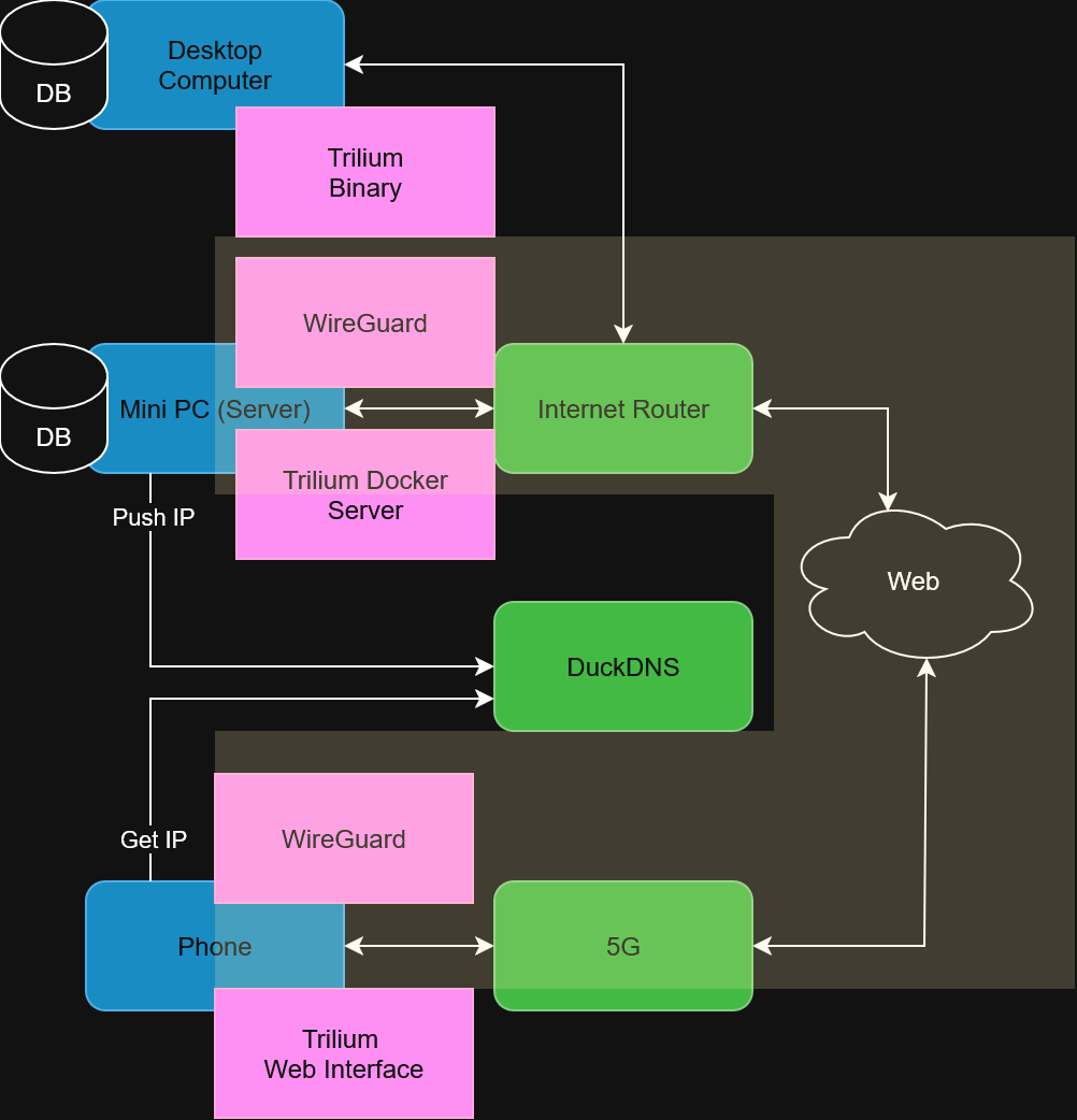 The final architecture diagram contains the Trilium Docker server, which hosts the synchronisation server and the web interface. The architecture contains a large yellow band that is a private VPN. All the notes will only be accessible once authenticated via an encrypted tunnel. That tunnel requires authentication using WireGuard VPN (free). The new architecture allows synchronising local Trilium to the server, allowing the phone to connect to the data.
