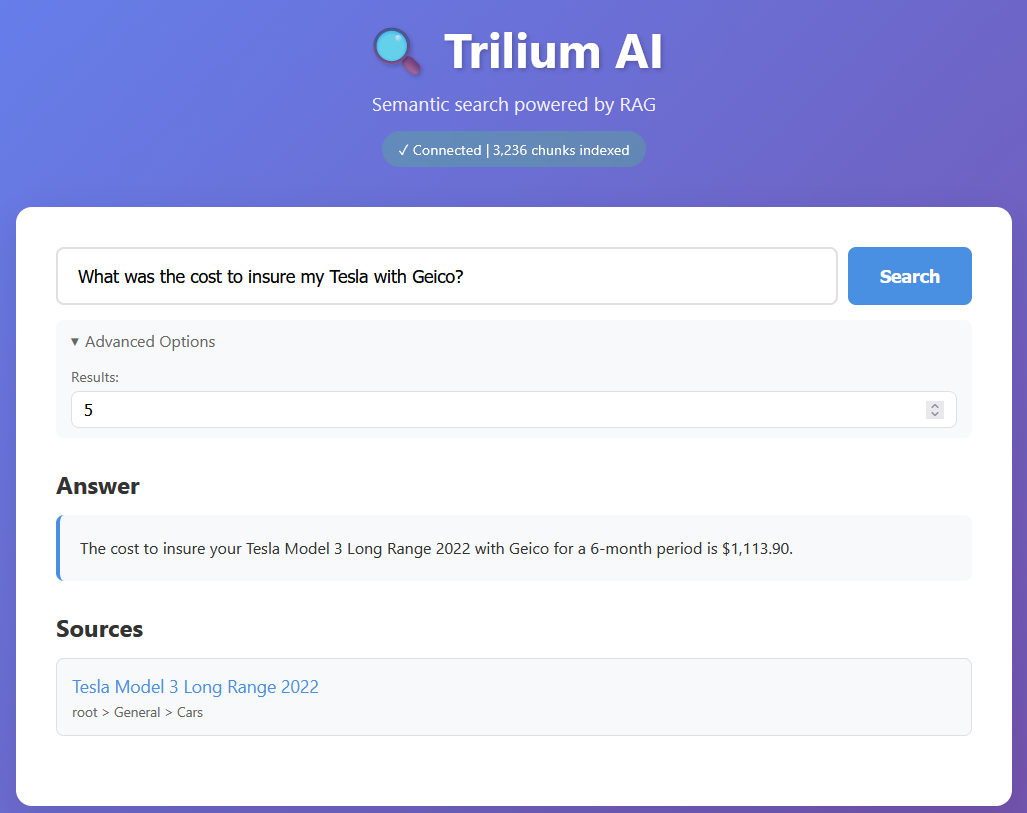 The results are not perfect, but they help narrow down relevant notes. One interesting aspect is that Trilium already has a web interface. This allows me to include source links in the answers, pointing directly to the original notes. I primarily use the web interface on my mobile device, safely through a private WireGuard tunnel.