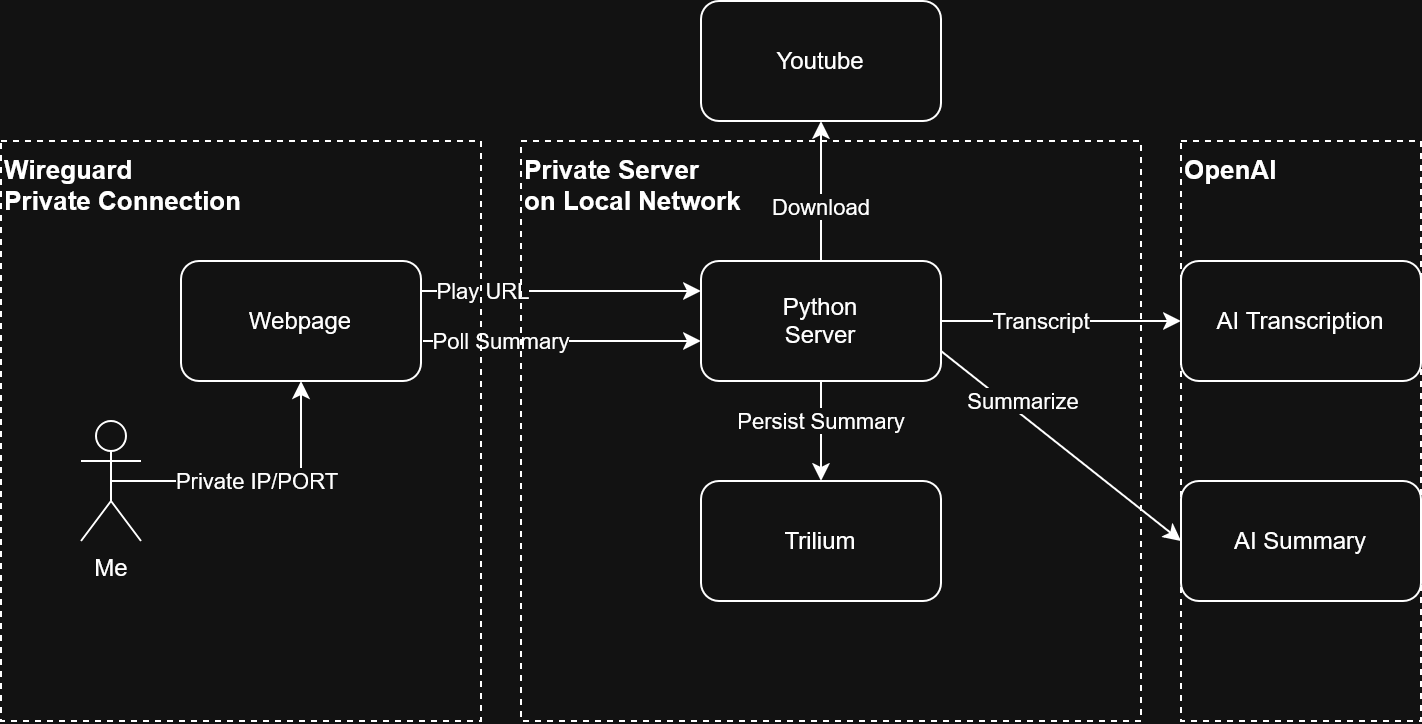 Then, I realized I could use AI to transcribe videos and generate summaries. Since I already host my personal notes in Trilium on my private server and Trilium has an API, the Python server can take the summary and automatically post it under a specific node in my notes.