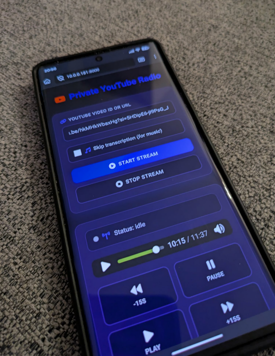 My initial idea was to create a private page on my network where I could paste a YouTube URL (or the video's unique ID) and have the server download the audio and stream it to me via a webpage.